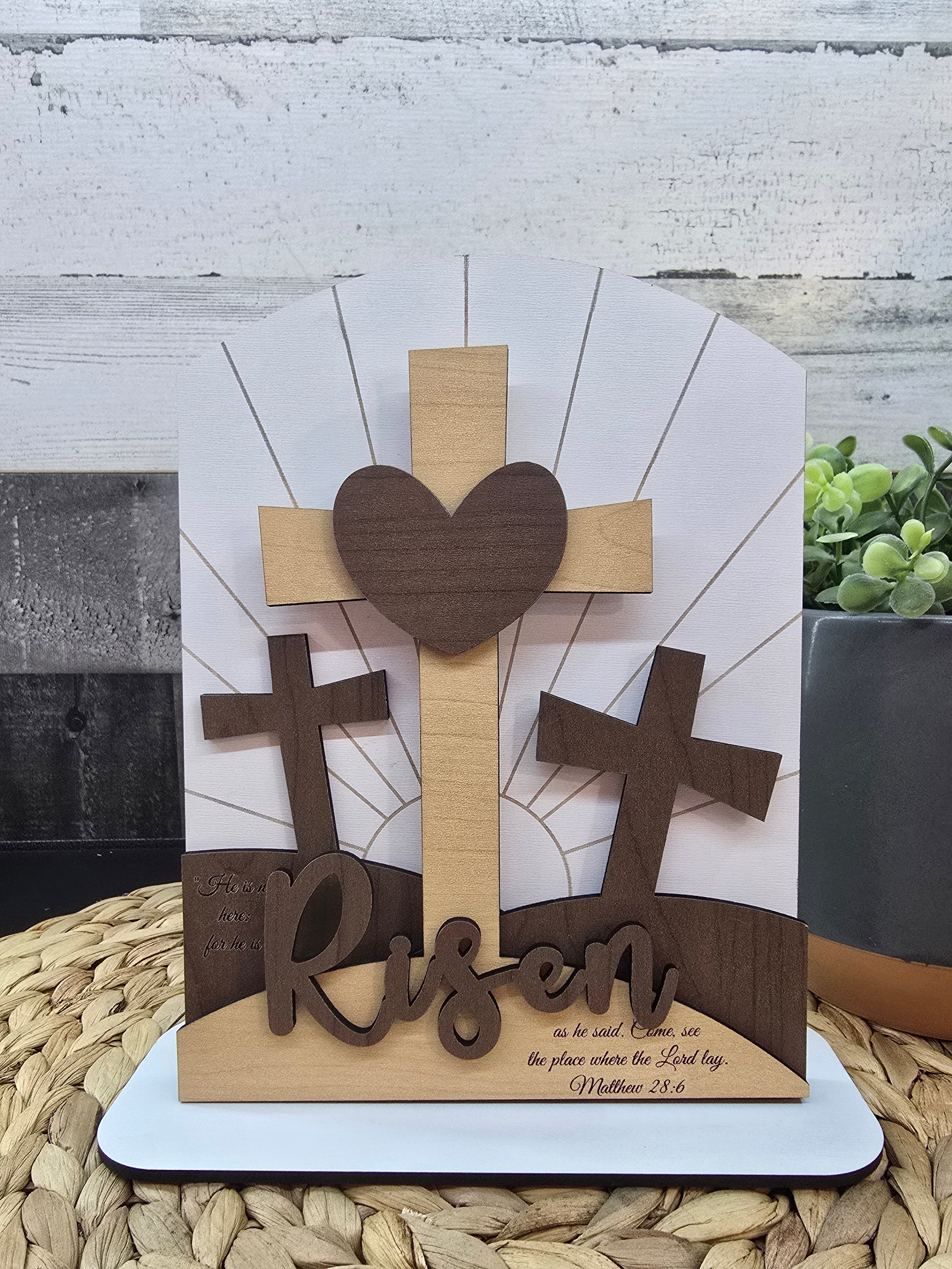Celebrate the joy of Easter with this beautifully crafted “He Is Risen” layered wooden heart sign. Featuring three crosses and a meaningful Scripture‑inspired design, this piece brings a warm, faith‑filled touch to your Spring décor. Its layered construction adds depth and dimension, making it a standout accent for mantles, shelves, entry tables, or Easter displays.